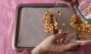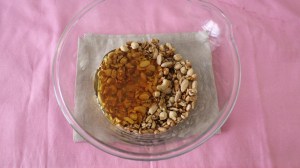 - Inserire il restante miele in una padella antiaderente sul fuoco, quando il miele sarà caldo aggiungere il composto ottenuto e cuocere per qualche minuto