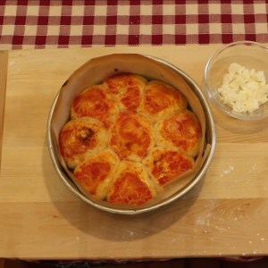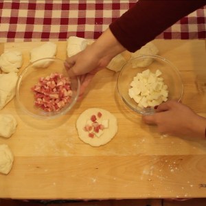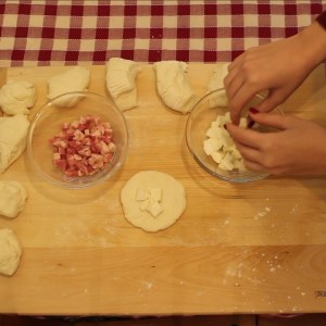 - Schiacciare tutti i pezzi di impasto e farcirli con pancetta e mozzarella. Infine richiuderli a forma di palla