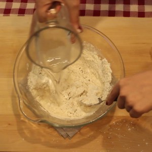- Aggiungere la farina ed iniziare a ”mescolare” con un cucchiaio. Aggiungere la restante acqua