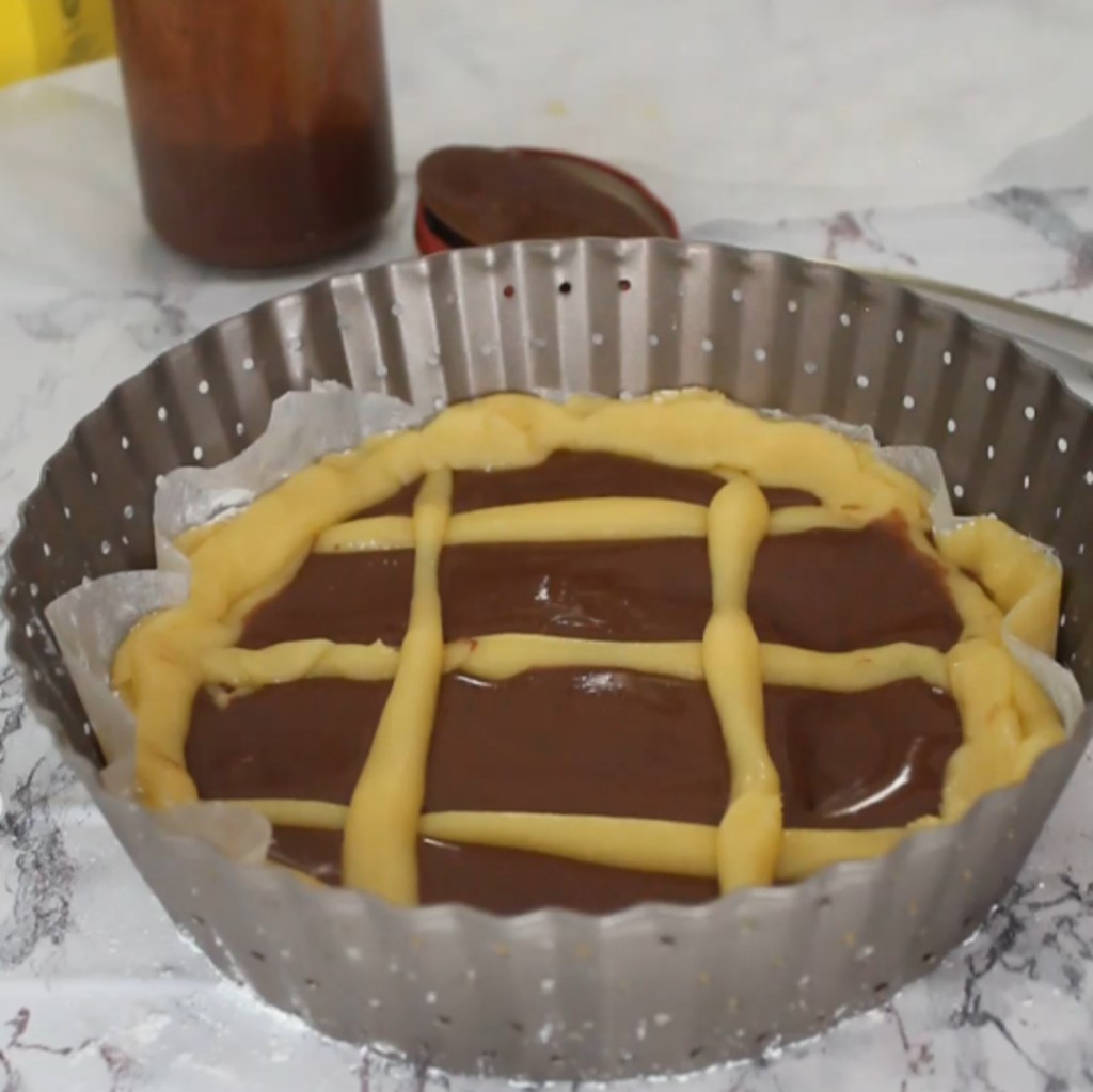 - Aggiungere la crema di nocciole e le decorazioni con la frolla restante (io ho fatto le classiche strisce)