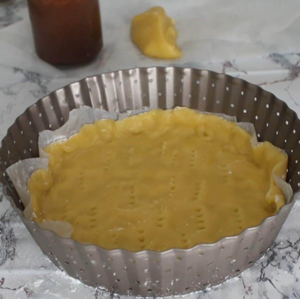 - Con un mattarello stendere 2/3 della frolla e sistemarla nello stampo imburrato ed infarinato scelto. Con una forchetta bucherellare la base di frolla