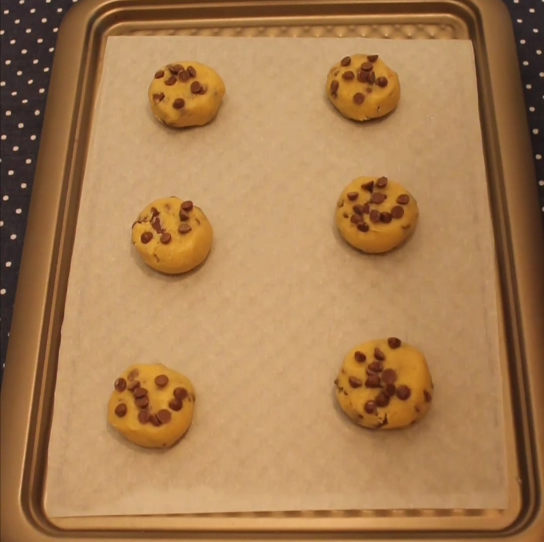 - Creare delle palline con l’impasto e posizionarle su una teglia distanziandole bene. Aggiungere qualche goccia di cioccolato a piacere