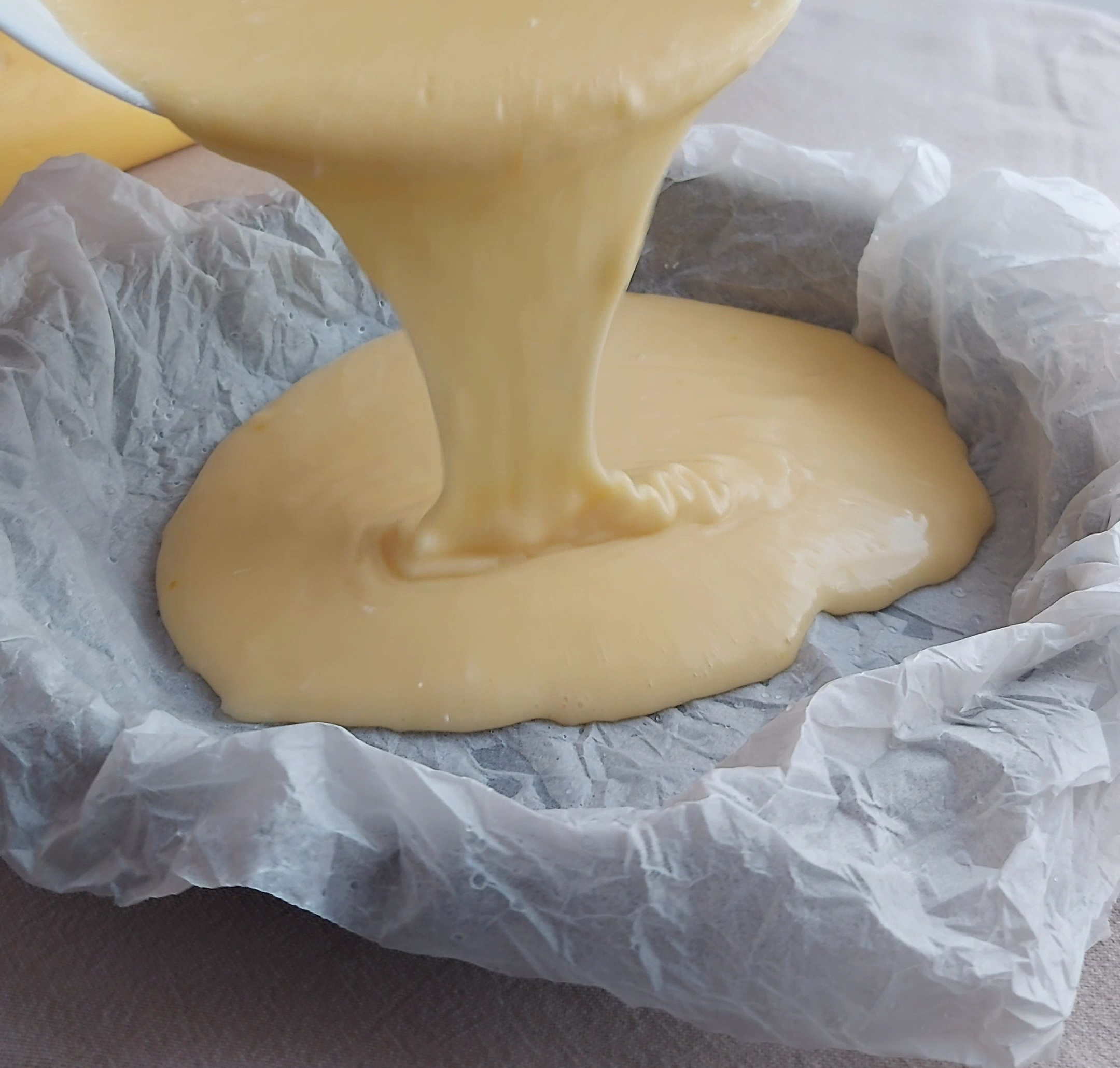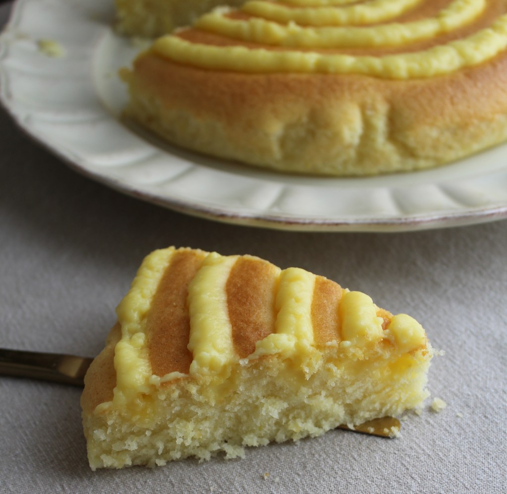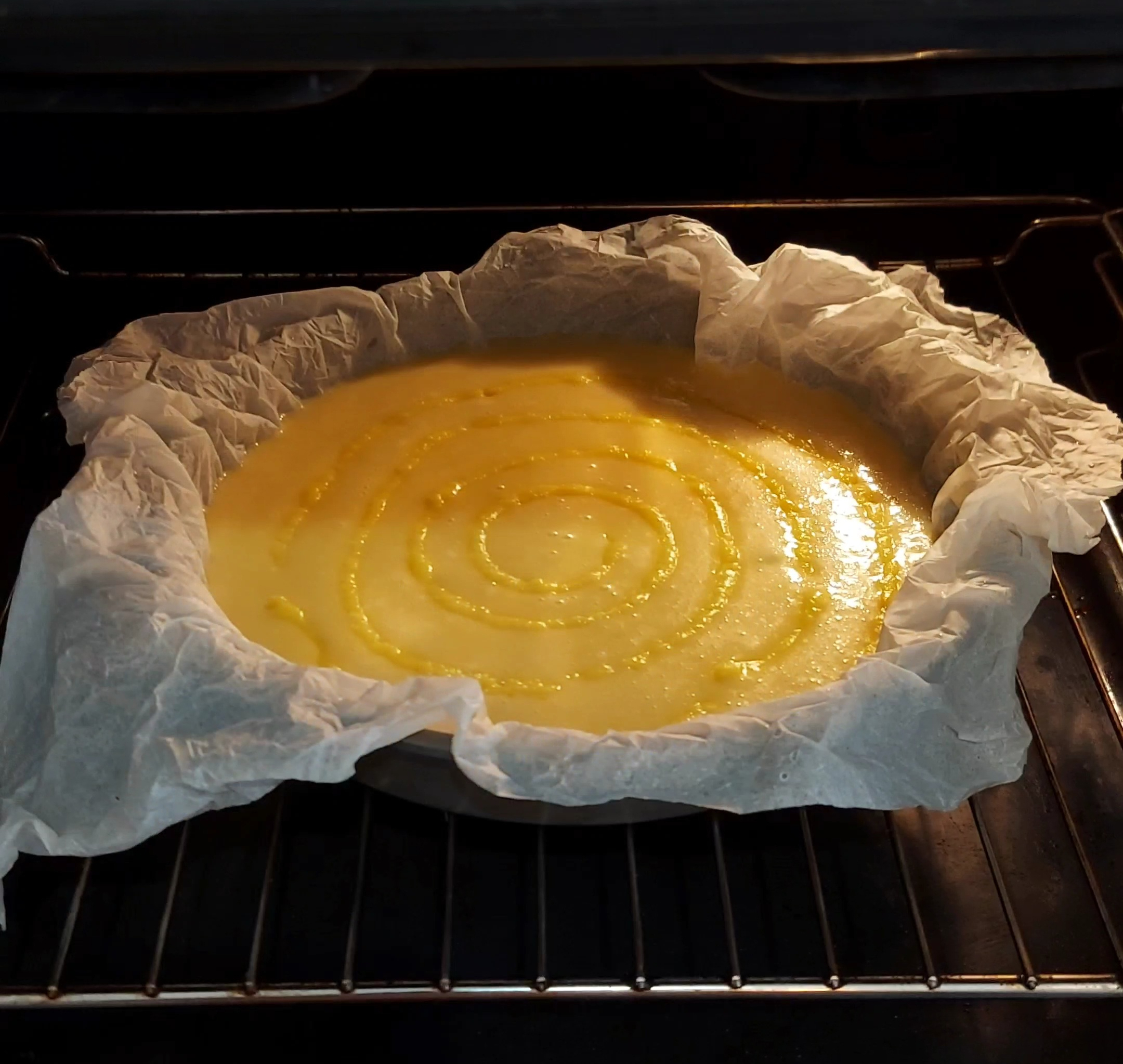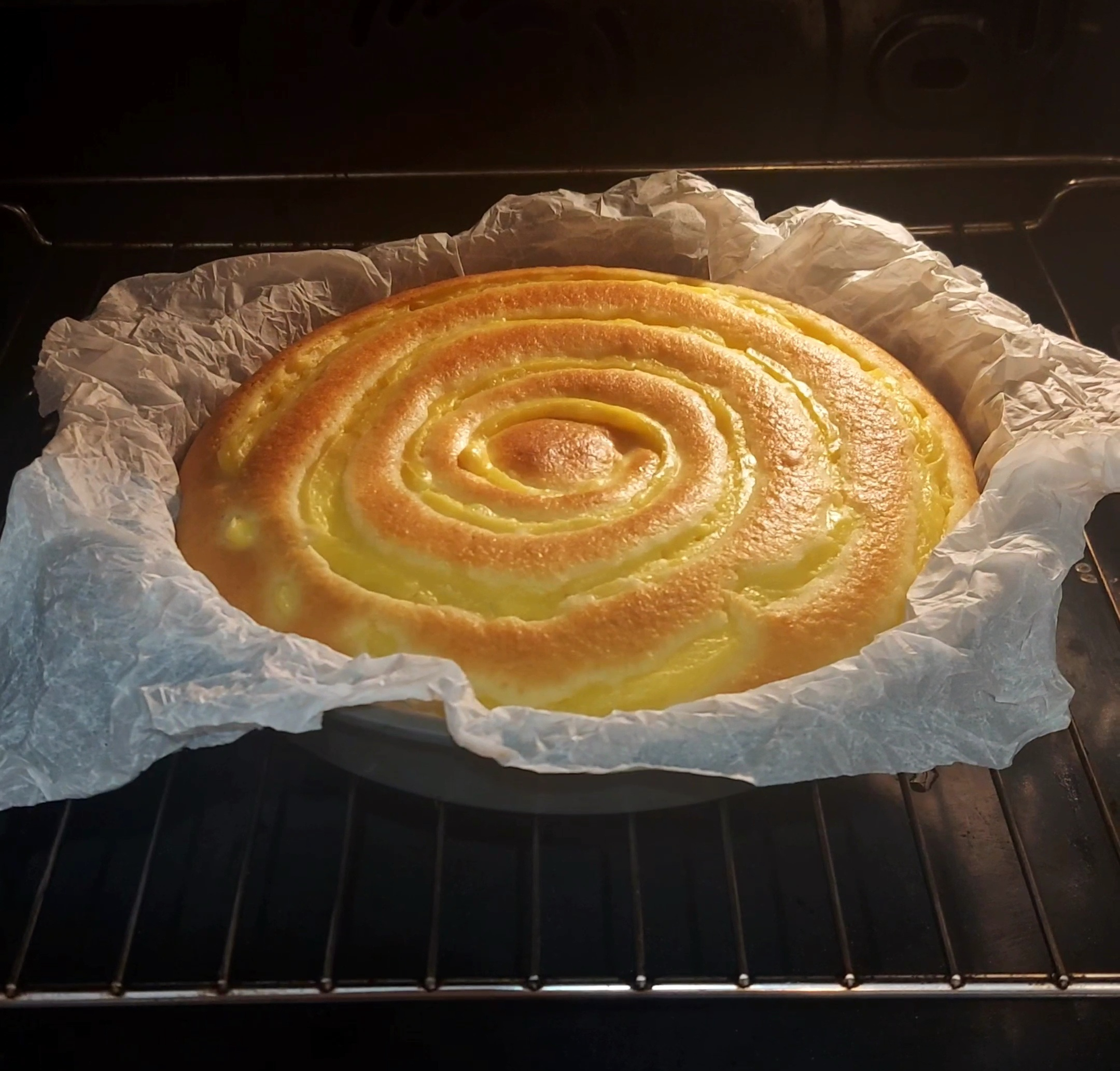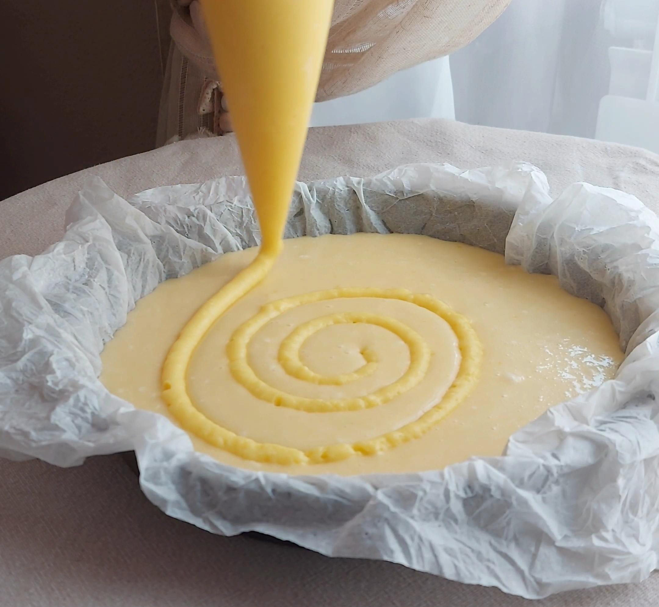 - Inserire il composto in uno stampo da 20cm e creare una girella con la crema pasticcera in superficie